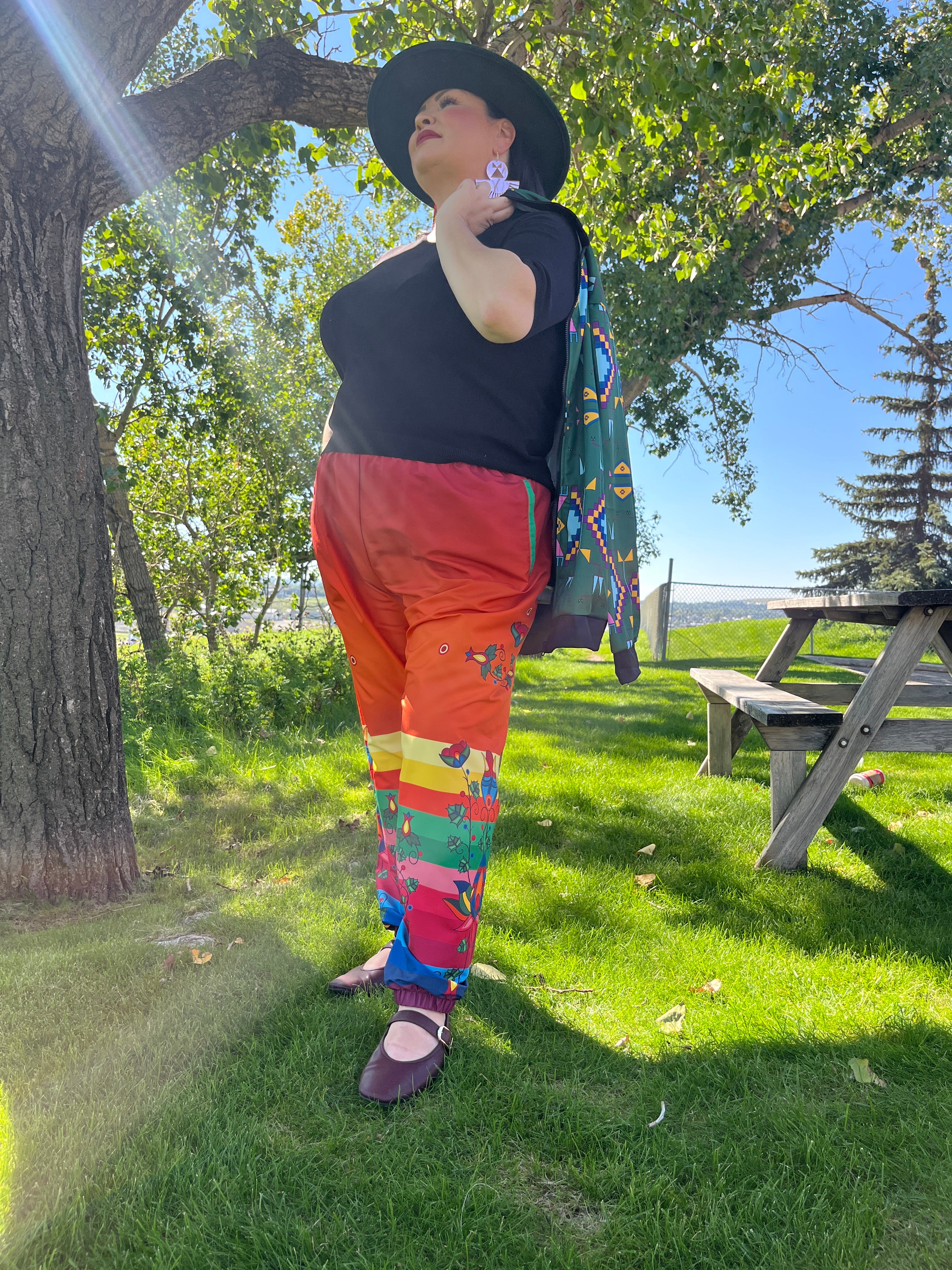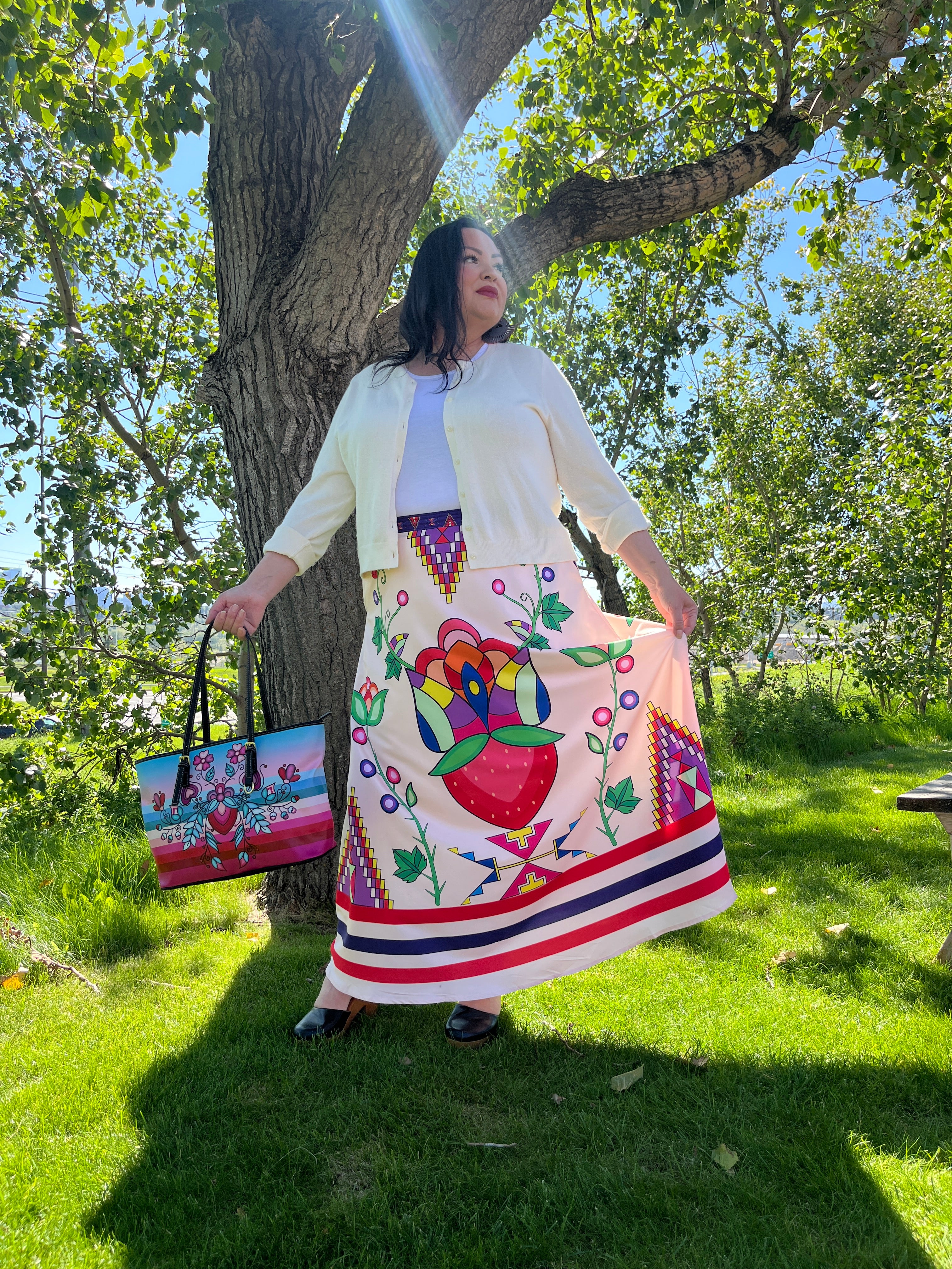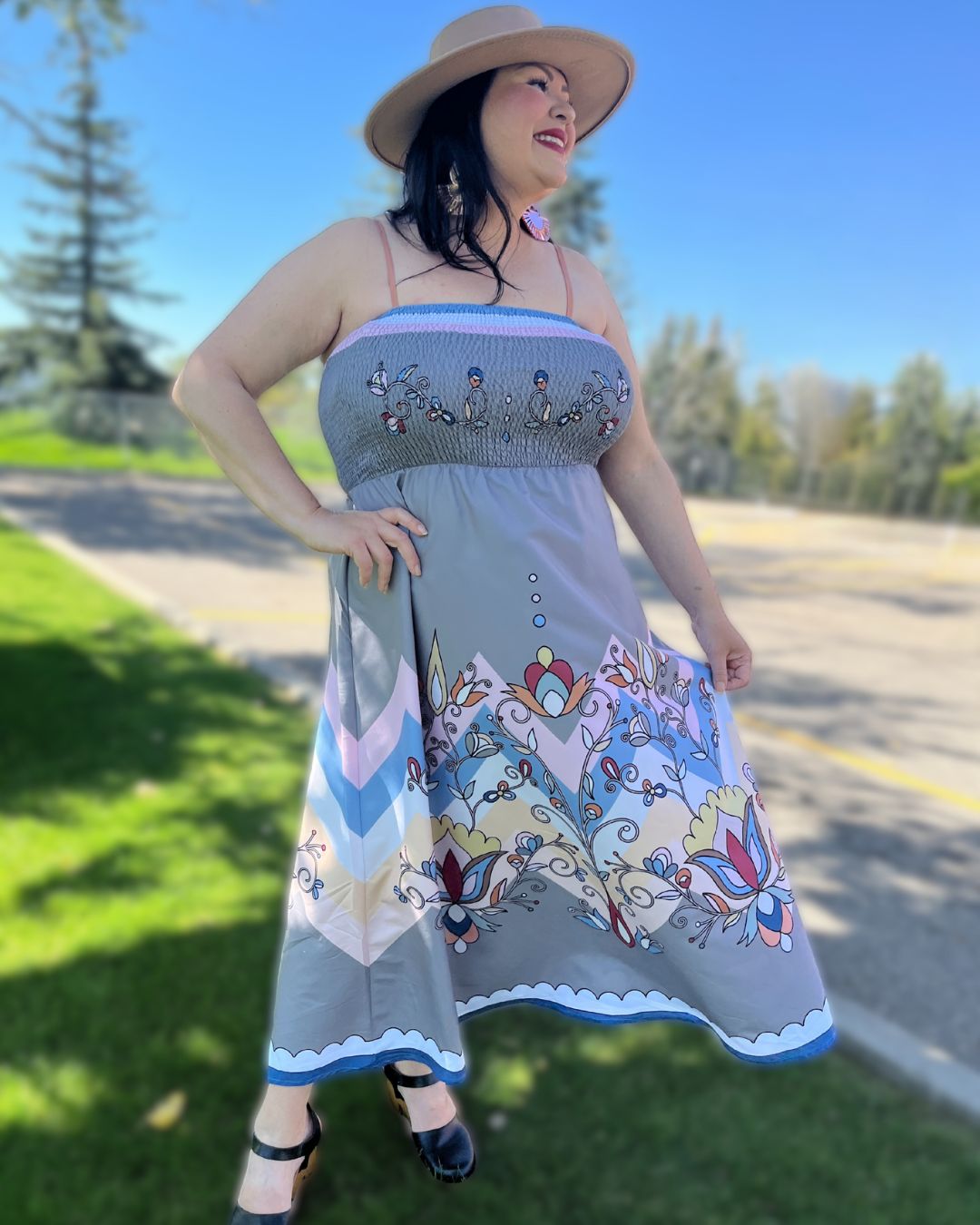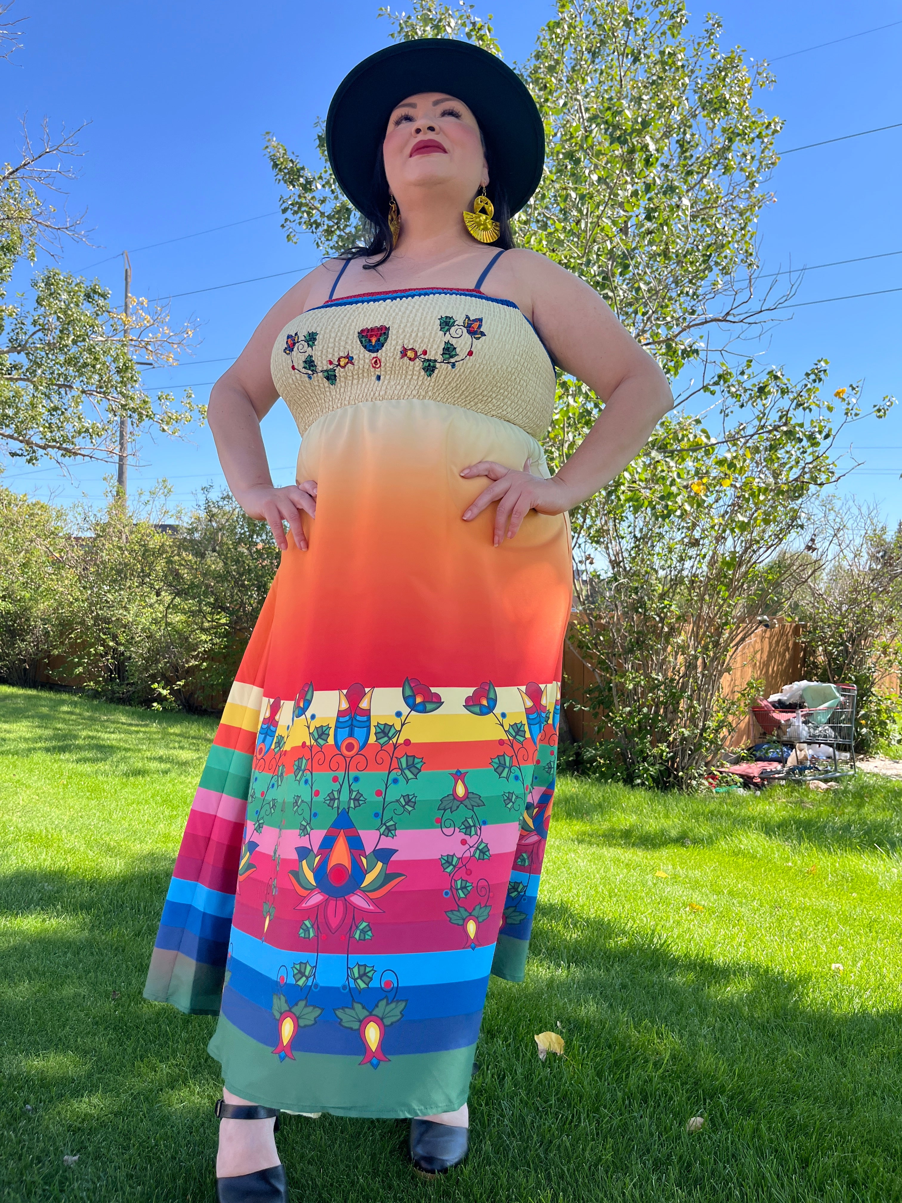 Inspired by the viral peasant dress style, our Strawberry design brings an Indigenous must have into the spotlight with a fresh summer twist. Featuring comfortable shoulder straps and a flattering, flowing silhouette, this dress is adorned with a bold print that mimics the intricate beauty of traditional beadwork. It’s the perfect blend of cultural homage and effortless summer fashion.